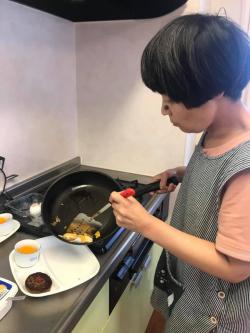 今朝のホームでの様子 朝の卵を焼くMさん。