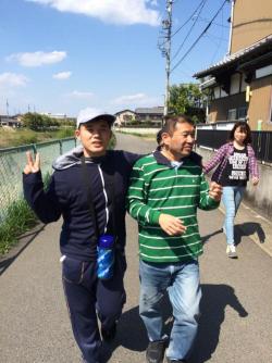 いつものように午後の散歩にグループの仲間たちと一緒に出掛けた大島さんと白﨑さん。時折職員に甘えるように肩を組んでくることがある白﨑さんですが、今日はなぜだか大先輩の大島さんと肩を組んでいます。すずかけ最年少の白﨑さんとすでに超ベテランの大島さんは親子ほどの年の差コンビ。でもこの微妙な感じが気にいったようで、楽しそうです。休憩をはさんで、作業所に帰ってくるまでそのまま肩を組んだままでした。今日の気持ちの良い風やお日様がそんな気持ちにさせたのでしょうか?